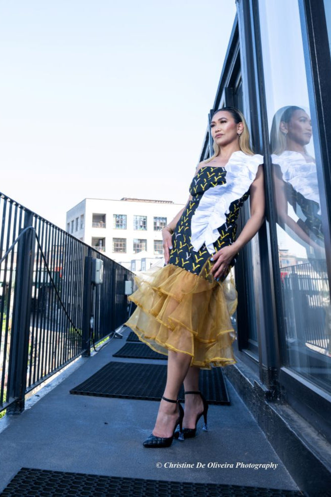 Make an unforgettable statement in this exquisitely crafted couture dress that embodies the perfect fusion of African elegance and contemporary design. This show-stopping piece features a sophisticated strapless bodice in premium Ankara fabric with a striking yellow geometric pattern against a deep noir background, complemented by a dramatic white satin ruffle detail cascading asymmetrically across the bodice.
