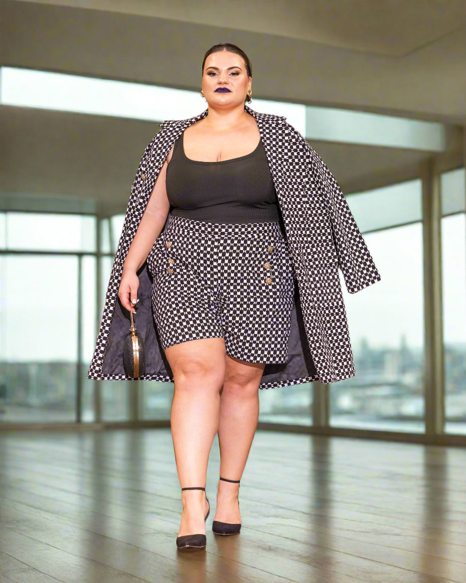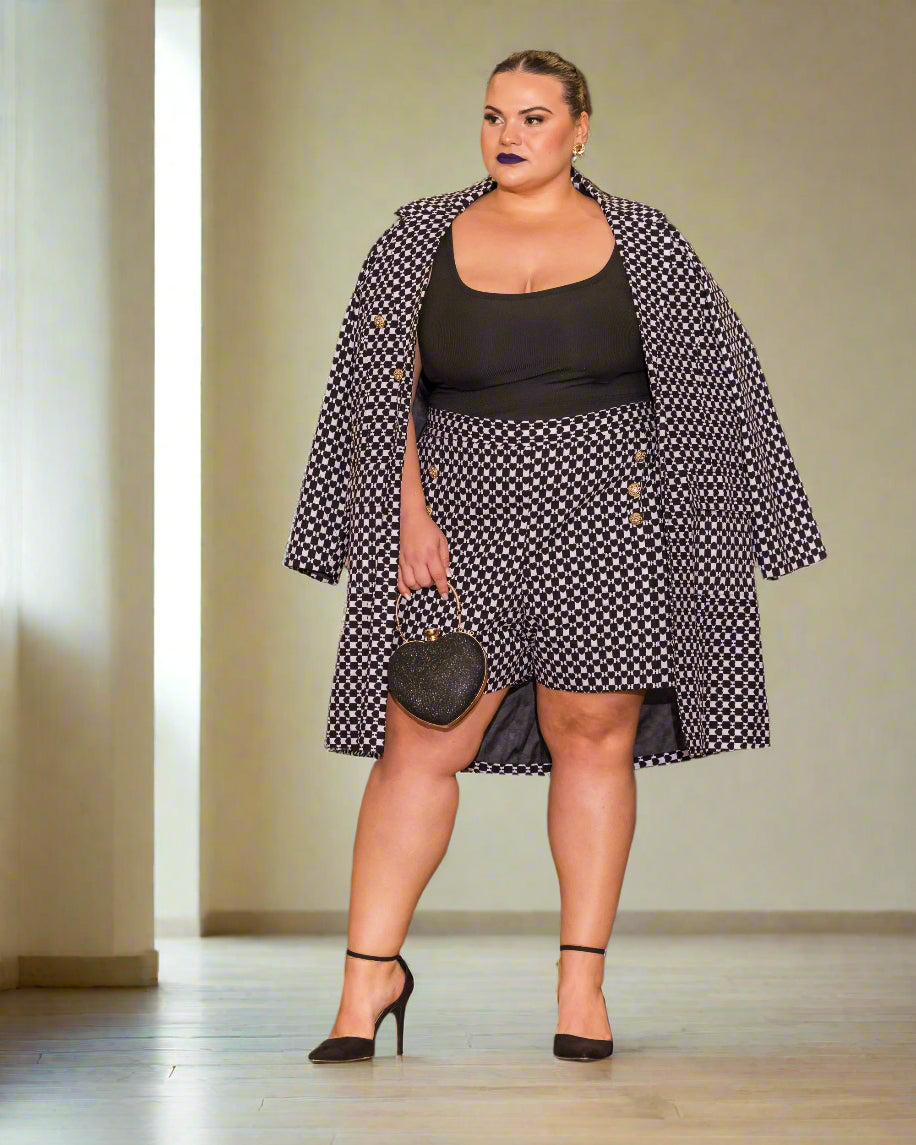 Expertly tailored by hand, this couture piece showcases precise structuring, luxe fabric flow, and a bold silhouette. The oversized double-breasted coat overlay paired with a pleated mini skirt silhouette creates a dynamic look that blends tradition with high fashion. Styled here with a fitted black bodice and finished with a statement heart-shaped handbag and pointed heels, this look is unapologetically fierce.